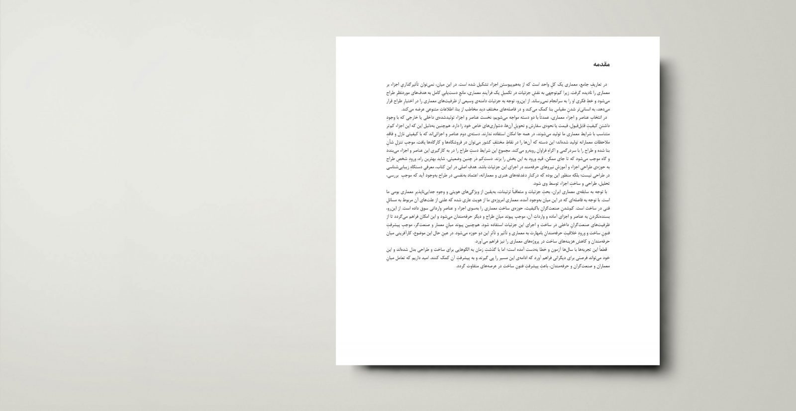 در طولِ سالهایی که بهکار حرفهایِ معماری در ایران مشغول بودهام، همواره کنجکاوی دربارهی جزئیاتِ معماری و نقش و جایگاهِ آن با من همراه بودهاست. برای بهخاطر آوردنِ نخستین ردپاهای این کنجکاوی، میتوانم تا روزهای پرفراز و نشیبِ دانشجویی به عقب برگردم؛ زمانی که تمایل به فکرکردن در مقیاسهای خُرد، باعث میشد تا دربارهی تعارضاتِ فنی و هنری در طراحیِ جزئیات، با پرسشهای بیشماری روبهرو شوم. شاید اصلیترین سؤال این بود که چرا علیرغمِ اینکه جزئیات در بنا دیده میشوند و حتی مخاطب، آنها را پررنگتر از حجمِ کلیِ بنا تجربه میکند، ما طراحی را در مرزِ پرداختن به این اجزاء متوقف میکنیم و سرنوشتشان را بهدستِ بایدها و نبایدهای فنی میسپاریم. آیا تعارضی که میانِ مصلحتهای فنی و مصلحتهای زیباییشناختی برقرار است، تعارضی حقیقی است یا کاذب؟ شاید این کنجکاویها زمانی برای من رنگوبویی تازه گرفت که فرصتِ همکاری با مهندس بهروز احمدی فراهم شد؛ ایشان در کنارِ تمامِ چیزهایی که به من آموخت، بابِ تفکر پیرامونِ ملاحظاتِ فنی و دستگاهِ زیباییشناختی بومی را نیز در ذهن من گشود؛ از اینرو، بیتردید این کتاب باید به ایشان پیشکش شود