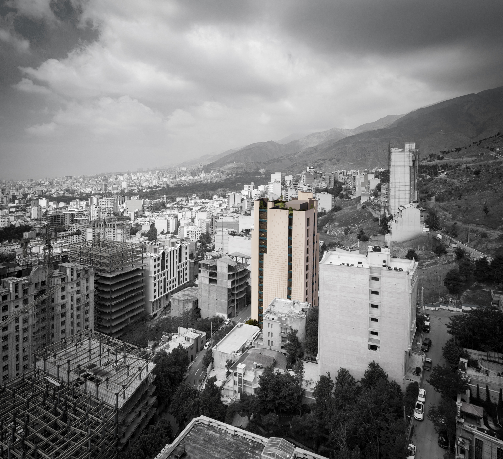 این ساختمانِ مسکونی در منتهیالیهِ شمالی تهران، در دامنهی کوهستان و در شیبِ بسیار زیاد قرار دارد؛ ازاینرو، تراز خیابان در شمالِ بنا برابر با همکف، در غرب برابر با زیرزمینِ یکم و در جنوب برابر با زیرزمینِ چهارم است. این ساختمان شامل سه زیرزمین برای پارکینگ و تأسیسات، یک زیرزمین و همکف برای مشاعات، دوازده طبقهی مسکونیِ دو واحدی و دو طبقهی فوقانیِ تک واحدی میباشد. مصالح پیشبینیشده برای نما، قطعات پیشساختهی GFRC و ورقهای مسِ اکسیدشده است.