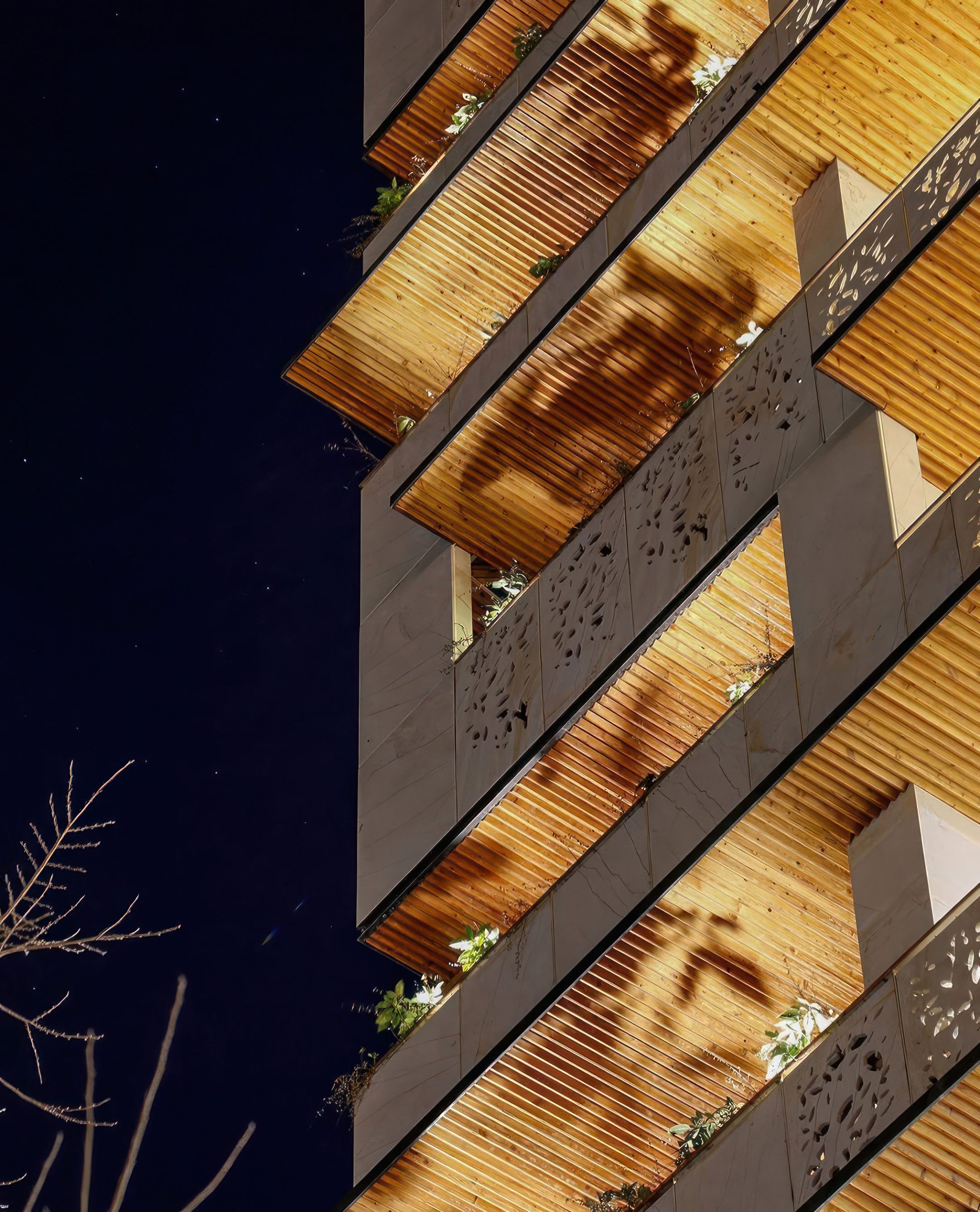با وجود تنوعی که در تیپ پلانها وجود دارد (چنانچه طبقات پایین دو واحدی و چهار طبقه بالایی تکواحدی است) در طراحی نما با بهره گرفتن از پوسته بیرون.. بالکنها، این تنوع مستور مانده است. در این پوسته دیتیلی خاص برای جانپناهی تماماً سنگی، که نقش برگها در آن مشبک شده است، طراحی شد و به کمک آن پیشانی کف سازهای طبقات پوشیده شد و پوستهای یکپارچه سنگی در نما حاصل گشت