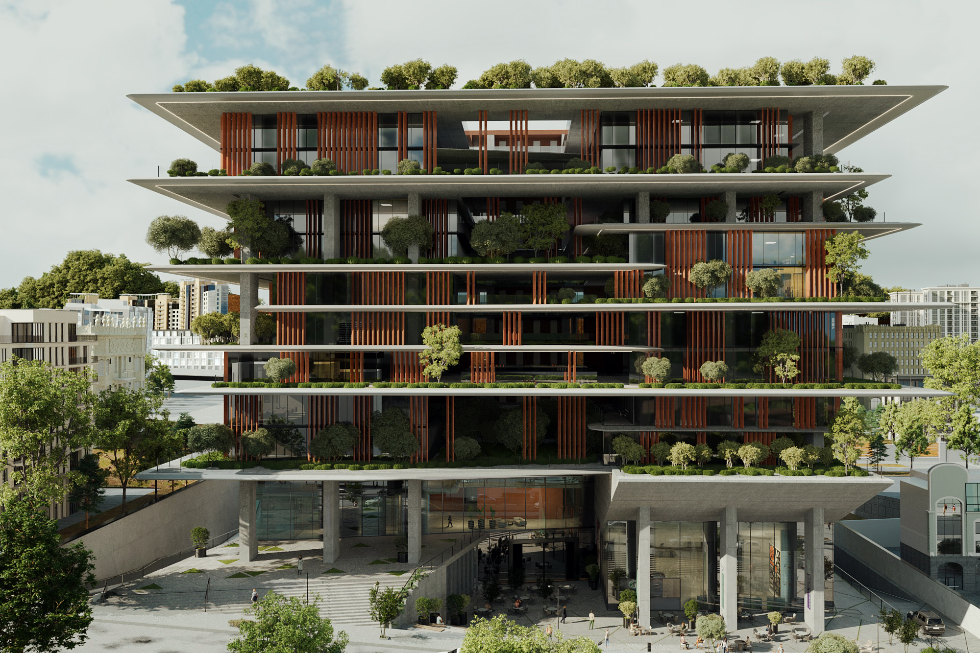 در طبقات اداری طراحی به گونه ای دیده شد تا با جابه جایی اسلب ها به جای نشان دادن ده طبقه،در واقع پنج طبقه را نشان دهیم و در عوض به صورت یکی درمیان از عرصه هر طبقه برای ایجاد فضای سبز طبقاتی(هم برای اداری ها و هم برای ایجاد سیمای شهری سبز) استفاده کنیم و این در حالی است که سطح اشغال را افزایش نداده ایم. حیاط های ایجاد شده با وویدهایی به یکدیگر اشراف دارند و فضای مطلوبی را برای استفاده کنندگان ایحاد میکنند.