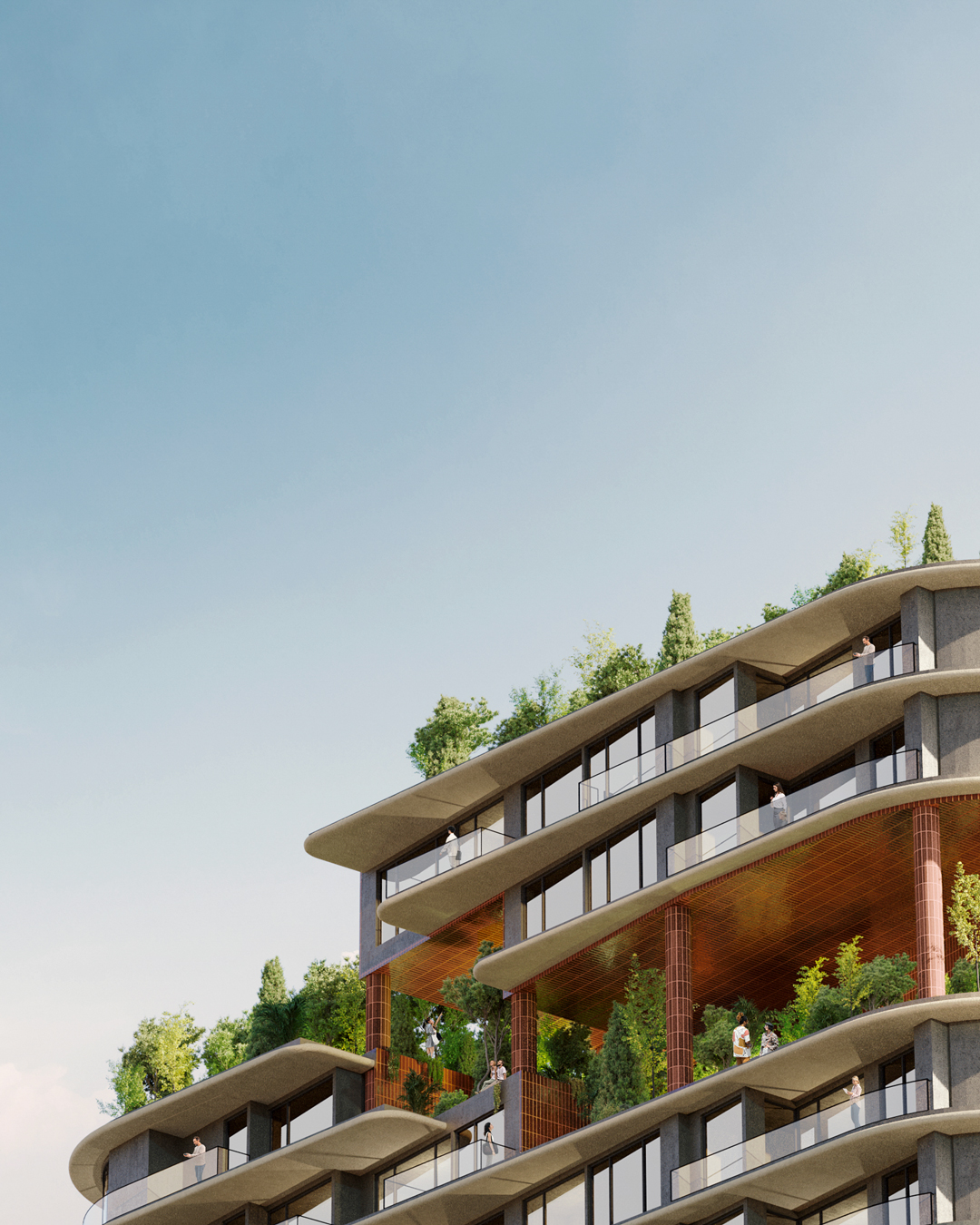 The Hamoon project, designed with the dual objectives of preserving and revitalizing ancient trees while enhancing urban living, spans an area of 2,610 square meters within the Darabad neighborhood of Tehran. Addressing the challenges of urban life and the diminishing sense of community, the project’s courtyard is meticulously crafted as a space for neighborly interaction and fostering a shared social experience among residents. Each floor is equipped with a shared courtyard among eight units, promoting human connections and a sense of community. This communal space also facilitates a continuous connection with nature, a concept that has been compromised in modern apartment living and is now primarily confined to shared lobbies at building entrances. In this project, shared living is elevated to new heights with a unique feature: a space twice the customary height, suspended at various angles. This elevated platform offers residents an unparalleled experience of social interaction, redefining ecological architecture within the contemporary residential fabric of Tehran.